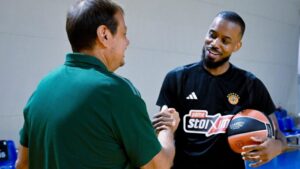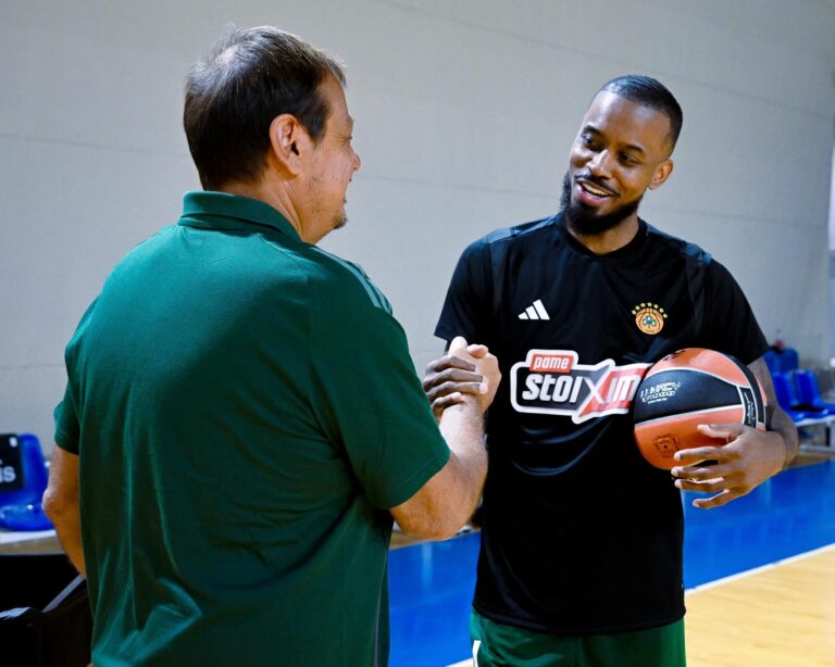 Ο Λορένζο Μπράουν στην πρώτη του προπόνηση ως παίκτης του Παναθηναϊκού διαλέγοντας και τον αριθμό της φανέλας.