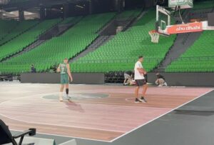 Ο Νίκος Ρογκαβόπουλος δεν αγωνίστηκε απέναντι στη Βιλερμπάν, όμως μετά το τέλος του αγώνα βγήκε στο παρκέ για ατομικό πρόγραμμα και σουτάκια.