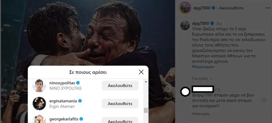 Δείτε το like του Εργκίν Αταμάν στην ανάρτηση του Δημήτρη Γιαννακόπουλου στο Instagram(via newspao):