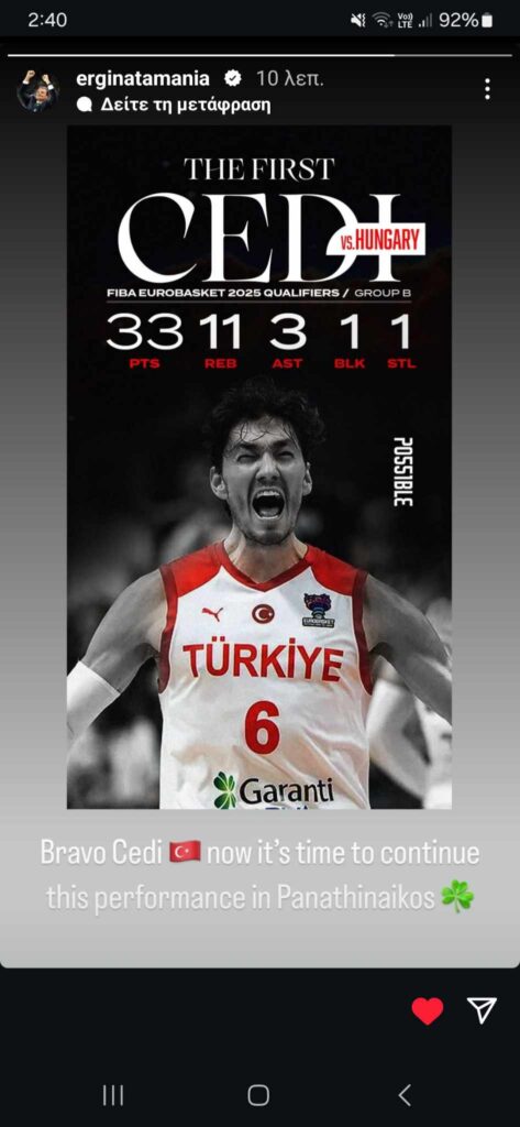 «Μπράβο Τζέντι, τώρα ήρθε η ώρα να συνεχίσεις αυτή την εμφάνιση στον Παναθηναϊκό», σημείωσε ο Τούρκος τεχνικός, δείχνοντας την εμπιστοσύνη του στις δυνατότητες του Όσμαν για τη συνέχεια της σεζόν.