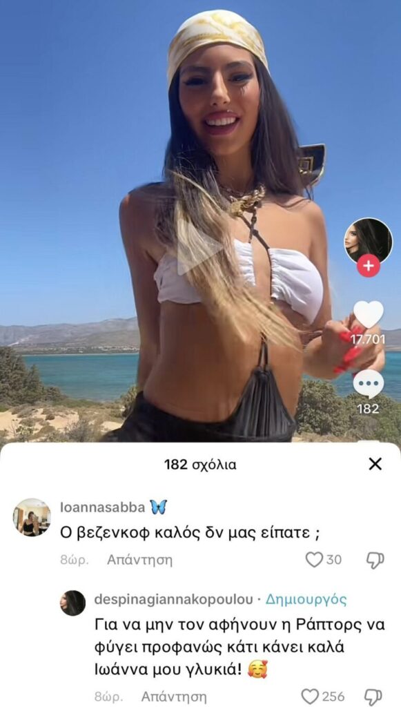 Η Δέσποινα Γιαννακοπούλου φρόντισε να…τρολλάρει μια φίλη του Ολυμπιακού στα μέσα κοινωνικής δικτύωσης, η οποία έκανε σχόλιο σε μια ανάρτηση της κόρης του μεγαλομετόχου του Παναθηναϊκού σχετικά με τον Σάσα Βεζένκοφ.