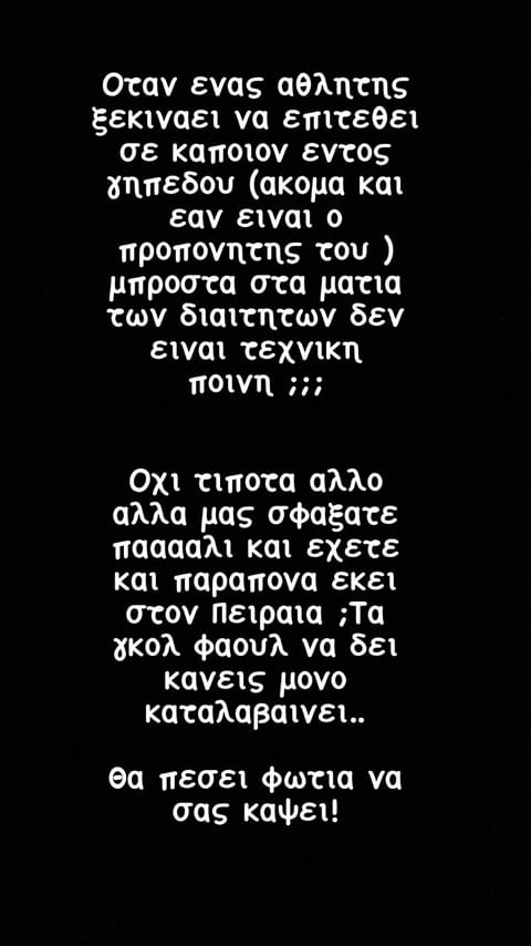 «Όταν ένας αθλητής ξεκινά να επιτεθεί σε κάποιον εντός γηπέδου (ακόμη κι αν είναι ο προπονητής του) μπροστά στα μάτια των διαιτητών δεν είναι τεχνική ποινή; Όχι τίποτε άλλο, αλλά μας σφάξατε πάααλι και έχετε και παράπονα εκεί στον Πειραιά; Τα γκολ-φάουλ να δει κανείς μόνο καταλαβαίνει… Θα πέσει φωτιά να σας κάψει. Αξίζει πραγματικά να δει κάποιος τη φάση με ένα κάρφωμα του Κώστα όπου στο ριπλέι φαίνεται πεντακάθαρο φάουλ και ξαφνικά πέφτει μουγκαμάρα. 30-70, 100-0, 30-70 και προχωράμε»