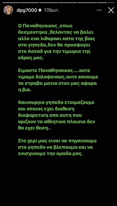 Ο Δημήτρης Γιαννακόπουλος με μία ανάρτηση του στο Instagram είπε ξεκάθαρα ότι ο Παναθηναϊκός δεν θα προσφύγει στο ΑΣΕΑΔ για μείωση της τιμωρίας ενώ έστειλε και μήνυμα περί τιμώμενων δολοφόνων.