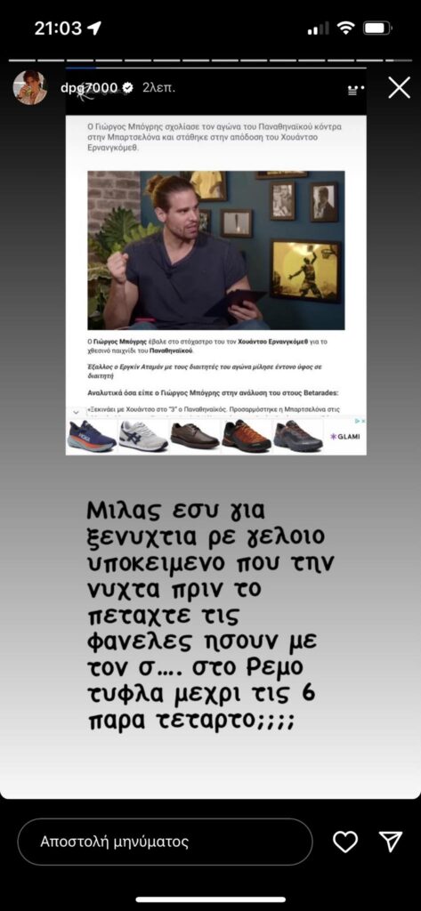Ο Δημήτρης Γιαννακόπουλος έκραξε τον Γιώργο Μπόγρη μέσω Instagram story για την τοποθέτηση του τελευταίου για τον Χουάντσο Ερνανγκόμεθ.
