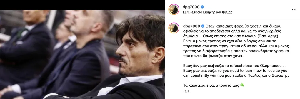 «Όταν κάποια/ κάποιες φορά θα χάσεις και δίκαια, οφείλεις να το αποδέχεσαι αλλά και να το αναγνωρίζεις δημόσια… Όπως επίσης όταν σε ευνοούν (ΠΑΟ – Άρης).