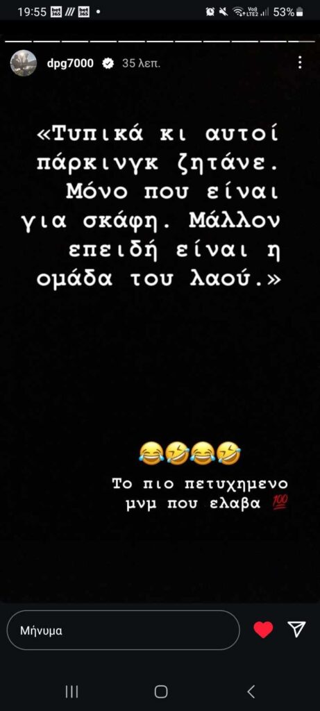 Συγκεκριμένα το story του ιδιοκτήτη της ΚΑΕ Παναθηναϊκός AKTOR γράφει: «Τυπικά και αυτοί πάρκινγκ ζητάνε. Μόνο που είναι για σκάφη. Μάλλον επειδή είναι η ομάδα του λαού». Με τον Δημήτρη Γιαννακόπουλο να σχολιάζει emojis που γελάνε και γράφοντας: «Το πιο πετυχημένο μήνυμα που έλαβα».