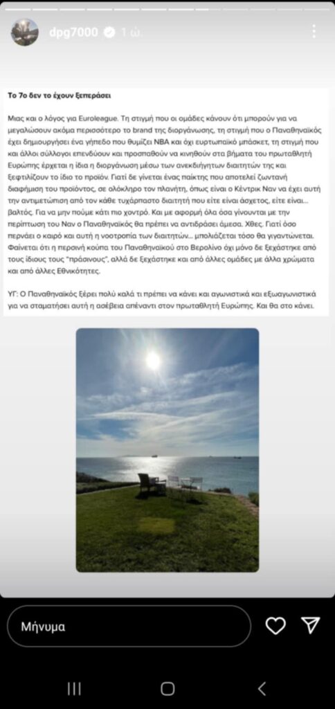 Ο ιδιοκτήτης της ΚΑΕ Παναθηναϊκός AKTOR, με ανάρτησή του στο Instagram, τοποθετήθηκε για ακόμη μία φορά για την εχθρική αντιμετώπιση που έχουν οι πρωταθλητές Ευρώπης από την διαιτησία της EuroLeague, τονίζοντας πως το έβδομο ευρωπαϊκό δεν έχει ξεχαστεί και πως αυτές οι ενέργειες εκ μέρους των διαιτητών υποβαθμίζουν το προϊόν της διοργάνωσης στο οποίο ο Παναθηναϊκός και άλλες ομάδες έχουν επενδύσει.