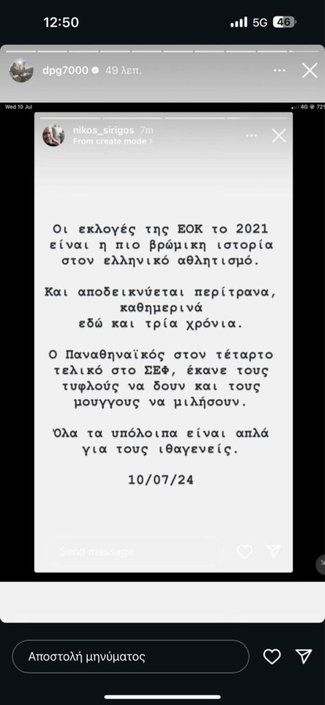 Ο Δημήτρης Γιαννακόπουλος μέσα από τον προσωπικό του λογαριασμό στο Instagram αναδημοσίευσε story του Νίκου Συρίγου το οποίο αναφερόταν στην ΕΟΚ του 2021.