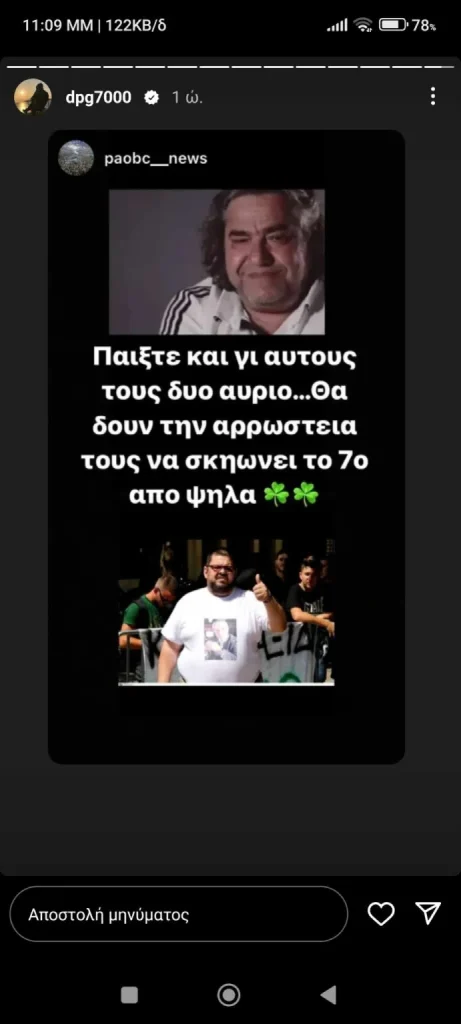Ο Δημήτρης Γιαννακόπουλος έκανε repost στο Instagram με τον «Μπασκετικό» και τον Παναγιώτη Κολλημένο με το μήνυμα «παίξτε και για αυτούς τους δύο αύριο… Θα δουν την αρρώστια τους να σηκώνει το έβδομο από ψηλά!».