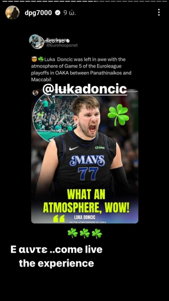 Ο Δημήτρης Γιαννακόπουλος ανέβασε ένα story με τον Λούκα Ντόντσιτς, γράφοντας: “Ε άιντε… come live the experience”, που σημαίνει “έλα να ζήσεις την εμπειρία”.