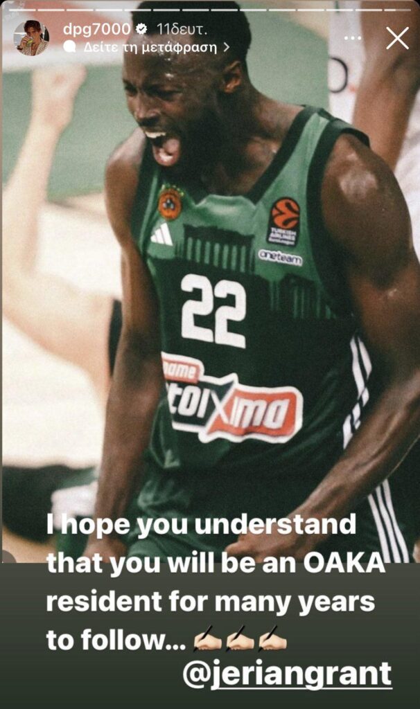 Ο Αμερικανός έχει εντυπωσιάσει τον κόσμο του Παναθηναϊκού και κυρίως τον Δημήτρη Γιαννακόπουλο, ο οποίος έστειλε το μήνυμα του μέσω του instagram για τον Γκραντ και ήταν κάτι παραπάνω από ξεκάθαρο: «Ελπίζω να καταλαβαίνεις ότι θα είσαι κάτοικος ΟΑΚΑ για πολλά χρόνια», έγραψε χαρακτηριστικά ο ισχυρός άνδρας της ΚΑΕ Παναθηναϊκός για τον 31χρονο γκαρντ.