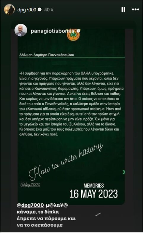 Ο Δημήτρης Γιαννακόπουλος μέσω Instagram story έκανε αναφορά σε φίλο του για το σωστό ΟΑΚΑ που έπρεπε να πάρει με βάση την τρέλα των φίλων του Παναθηναϊκού.