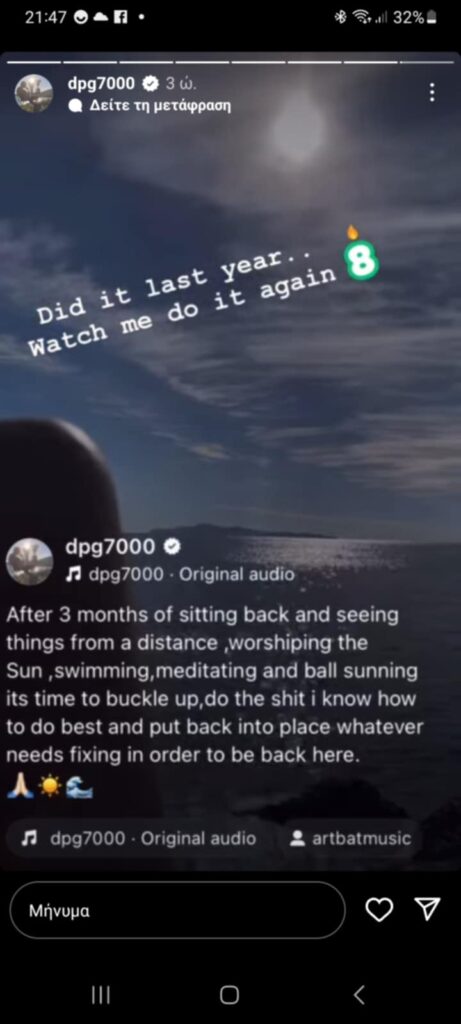 «Μετά από 3 μήνες καθισμένος παρακολουθώντας τα πράγματα από απόσταση, υπηρετώντας τον ήλιο, κολυμπώντας, κάνοντας διαλογισμό, κάνοντας ηλιοθεραπεία, είναι ώρα να δέσω τη ζώνη μου και να κάνω αυτό που ξέρω καλύτερα και να βάλω πίσω στη θέση του ό,τι χρειάζεται φτιάξιμο προκειμένου να βρεθώ πίσω εκεί».