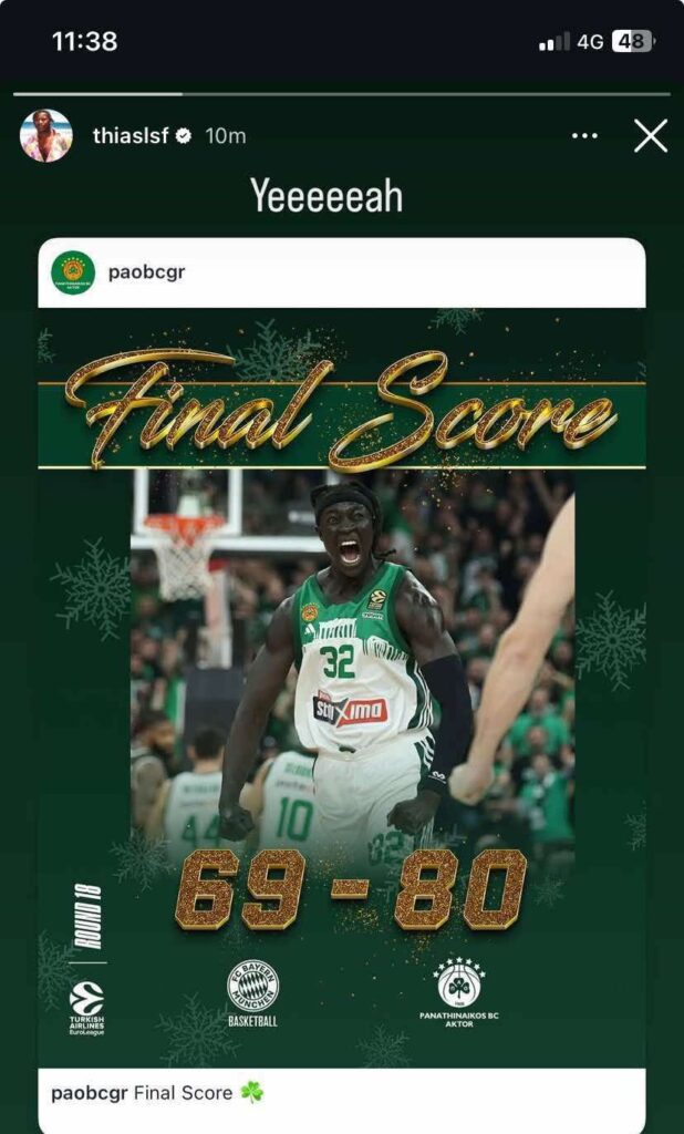 Ωστόσο ο σέντερ του Παναθηναϊκού δεν παρέλειψε να πανηγυρίσει τη νίκη της ομάδας του στο Μόναχο, καθώς δημοσίευσε story στο Instagram με το τελικό σκορ της αναμέτρησης και έγραψε: «Ναιιιι»