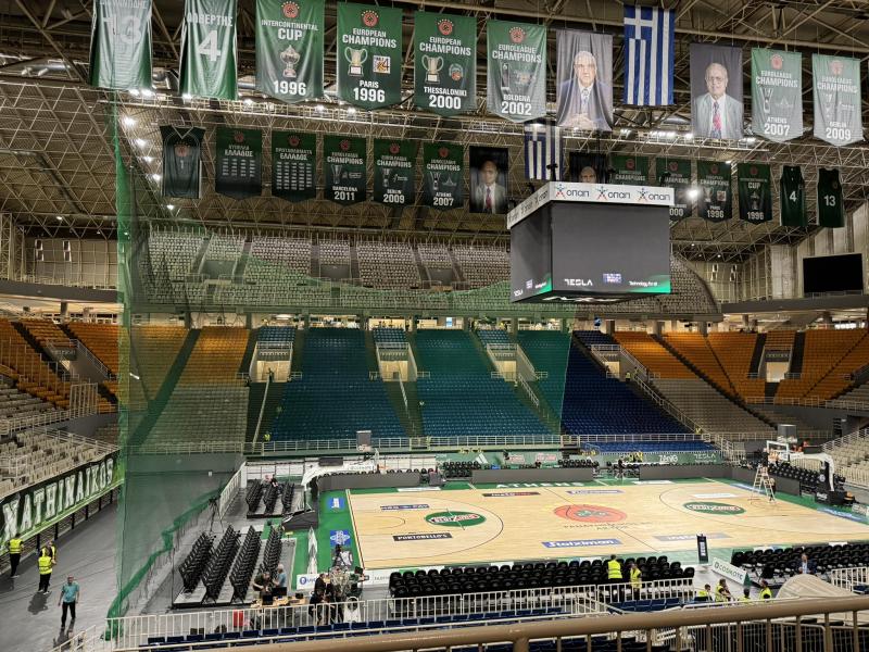 Σε λίγη ώρα ξεκινάει ο πρώτος μεγάλος τελικός της Stoiximan Basket League ανάμεσα σε Παναθηναϊκό και Ολυμπιακό με το προστατευτικό δίχτυ να τοποθετείται κανονικά όπως γίνεται σε κάθε παιχνίδι στο ΟΑΚΑ.