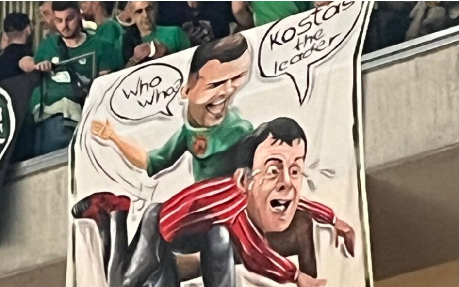 Οι φίλοι του Παναθηναϊκού πήραν την θέση τους στην Uber Arena βάζοντας και ένα πανό στην εξέδρα με εικονιζόμενους τους Κώστα Σλούκα και Γιώργο Μπαρτζώκα.