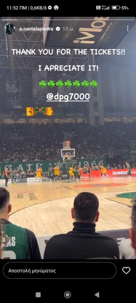 Συγκεκριμένα ο Αϊτόρ Κανταλαπιέντρα αλλά και ο Γιάννης Κώτσιρας βρέθηκαν στο πλάι του Παναθηναϊκού με τον Ισπανό εξτρέμ να ευχαριστεί τον Δημήτρη Γιαννακόπουλο για το εισιτήριο που του βρήκε, αφού το ματς ήταν sold-out.