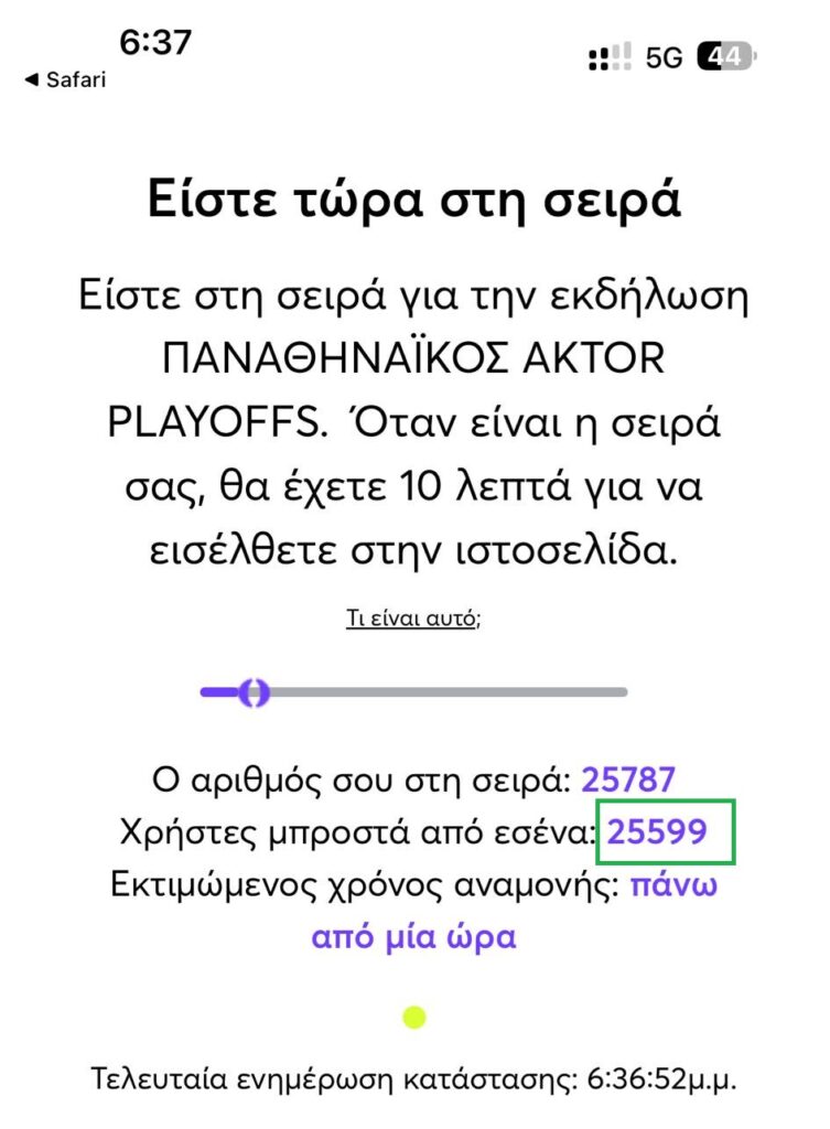 Όπως μπορείτε να δείτε και παρακάτω, ακριβώς 11 λεπτά μετά την κυκλοφορία των εισιτηρίων, βρίσκονταν στην αναμονή του more.com πάνω από 25.000 άτομα! Μιλάμε για έναν απίστευτο αριθμό, που δείχνει με τον πιο χαρακτηριστικό τρόπο την «τρέλα» που υπάρχει αυτή τη στιγμή στον κόσμο του Παναθηναϊκού για την ομάδα.