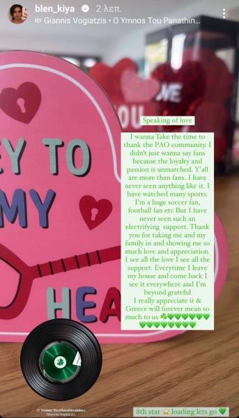 Αλλά δεν έχω δει ποτέ τόσο ηλεκτρισμένη υποστήριξη. Σας ευχαριστώ που δεχθήκατε εμένα και την οικογένειά μου και μου δείξατε τόση αγάπη και εκτίμηση. Βλέπω όλη την αγάπη και όλη την υποστήριξη. Κάθε φορά που φεύγω από το σπίτι μου και επιστρέφω το βλέπω παντού και είμαι πολύ ευγνώμων, το εκτιμώ πραγματικά και η Ελλάδα θα σημαίνει για πάντα τόσα πολλά για εμάς. Πάμε για το 8ο αστέρι!».