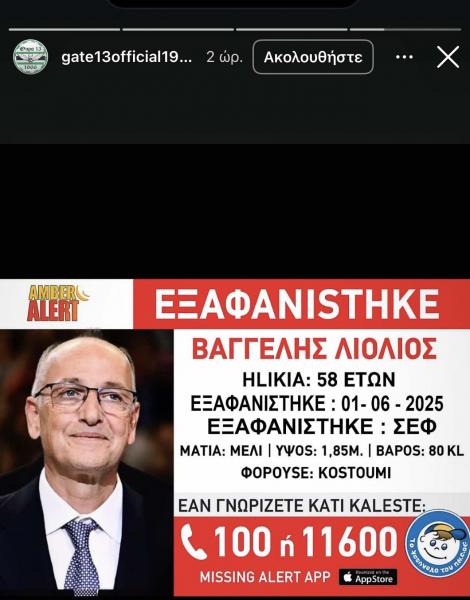 Αυτό δεν έμεινε ασχολίαστο από τους οργανωμένους οπαδούς του Παναθηναϊκού, καθώς η Θύρα 13 ανέβασε story στα social media με το λογότυπο του γνωστού «Amber Alert» και την ειρωνική φράση: «Εξαφανίστηκε ο Βαγγέλης Λιόλιος».