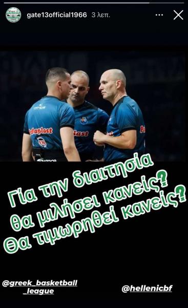 Συγκεκριμένα, σε νέο story, η οργανωμένη κερκίδα των φίλων του Παναθηναϊκού δημοσίευσε φωτογραφία με τους τρεις διαιτητές του Game 2 και έγραψε με νόημα:
