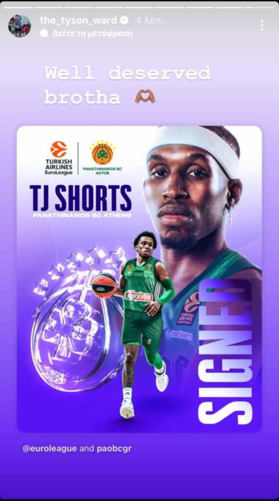 Μια όμορφη στιγμή εκτυλίχθηκε στα social media, με τον Τάισον Ουόρντ να απευθύνει δημόσια τα συγχαρητήριά του στον πρώην συμπαίκτη του, Τι Τζέι Σορτς, για τη μεταγραφή του στον Παναθηναϊκό.
