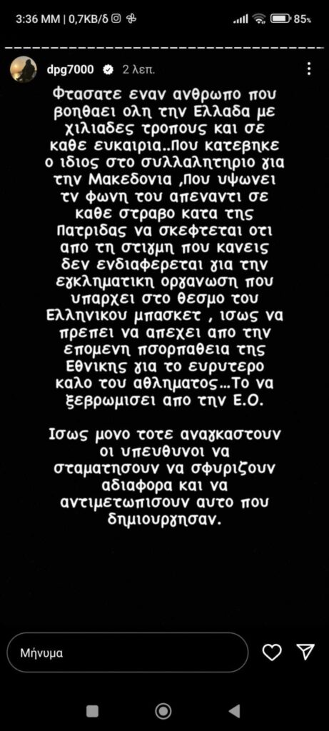 Ο Δημήτρης Γιαννακόπουλος μέσω ανάρτησης του στο Instagram μίλησε για μία πιθανή απόχη από την Εθνική ομάδα λόγω των όλων αυτών που συμβαίνουν με την διαιτησία.