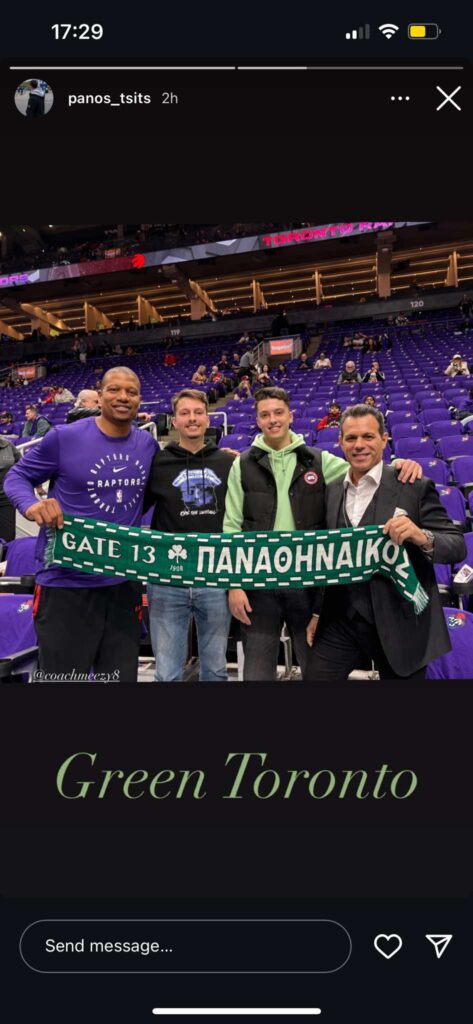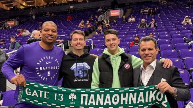 Οι Μάικ Μπατίστ και Δημήτρης Ιτούδης φωτογραφήθηκαν με δύο φιλάθλους του Παναθηναϊκού που βρέθηκαν στο γήπεδο των Τορόντο Ράπτορς.