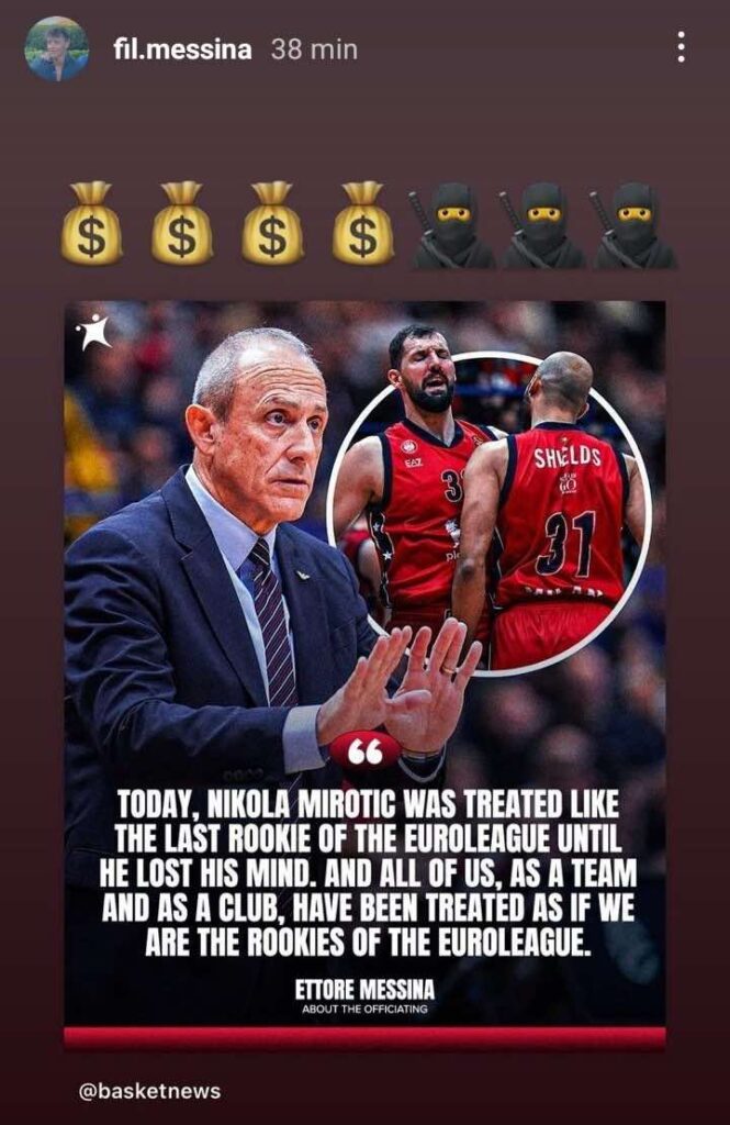 Η έντονη κριτική για τη διαιτησία στον αγώνα της Αρμάνι Μιλάνο με τον Ολυμπιακό (83-84) συνεχίζεται, με τον γιο του Έτορε Μεσίνα να προκαλεί αίσθηση μέσω ενός αιχμηρού στόρι στο Instagram.