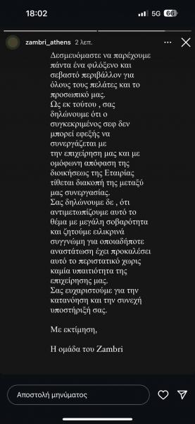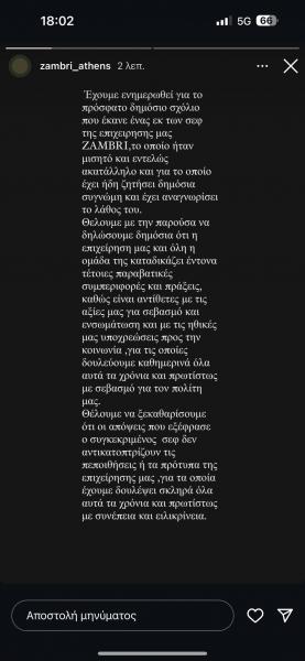 «Έχουμε ενημερωθεί για το πρόσφατο δημόσιο σχόλιο που έκανε ένας εκ των σεφ της επιχείρησης μας ZAMBRI, το οποίο ήταν μισητό και εντελώς ακατάλληλο και για το οποίο έχει ήδη ζητήσει δημόσια συγνώμη και έχει αναγνωρίσει το λάθος του.