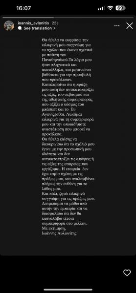 «Θα ήθελα να εκφράσω την ειλικρινή μου συγγνώμη για το σχόλιο που έκανα σχετικά με παίκτη του Παναθηναϊκού. Τα λόγια μου ήταν πληγωτικά και ακατάλληλα, και μετανιώνω βαθύτατα για την προσβολή που προκάλεσαν. Καταλαβαίνω απτό η πράξη μου αυτή δεν αντικατοπτρίζει τις αξίες του σεβασμού και της αθλητικής συμπεριφοράς που αξίζει ο κόσμος του μπάσκετ και το Ευ Αγωνίζεσθαι. Λυπάμαι ειλικρινά για τη συμπεριφορά μου και και την οποιαδήποτε αναστάτωση που μπορεί να προκάλεσα. Θα ήθελα επίσης να διευκρινίσω ότι το σχόλιο μου έγινε με την προσωπική μου ιδιότητα και δεν αντικατοπτρίζει τις απόψεις ή τις αξίες της εταιρείας που εργάζομαι. Η εταιρεία δεν έχει κανιά σχέση με τις πράξεις μου, και αναλαμβάνω πλήρως την ευθύνη για το λάθος μου. Και πλάι, ζητώ ειλικρινά συγγνώμη για τις πράξεις μου. Δεσμεύομαι να μάθω από αυτήν την εμπειρία και να διασφαλίσω ότι δεν θα επαναλάβω τέτοια συμπεριφορά στο μέλλον. Με εκτίμηση, Ιωάννης Αυλωνίτης»
