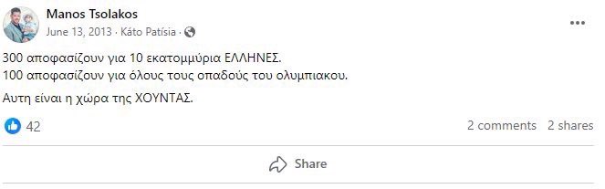 Ο Έλληνας διαιτητής είχε γράψει σε ανάρτηση του στο Facebook: «300 αποφασίζουν για 10 εκατομμύρια ΕΛΛΗΝΕΣ. 100 αποφασίζουν για όλους τους οπαδούς του Ολυμπιακού. Αυτή είναι η χώρα της Χούντας». Αξίζει να σημειωθεί ότι η ημερομηνία που το έγραψε είναι μια μέρα μετά από το Game 3 των τελικών του 2013. Τότε που ο Παναθηναϊκός του Αργύρη Πεδουλάκη «σκούπισε» τον Ολυμπιακό. Έντεκα χρόνια μετά βέβαια ο Γιώργος Μπαρτζώκας θυμήθηκε να μας ενημερώσει ότι δεν έγινε ποτέ 3-0.