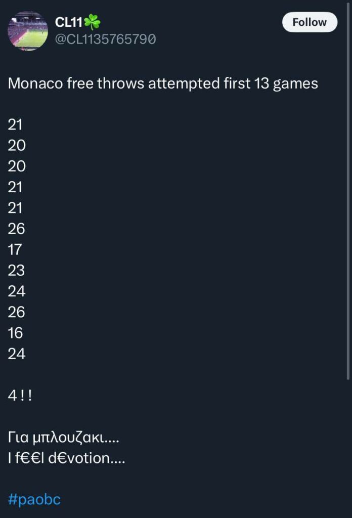 Στα πρώτα 13 παιχνίδια της στη φετινή EuroLeague, η Μονακό έχει εκτελέσει κατά μέσο όρο πάνω από 20 ελεύθερες βολές ανά αγώνα, ενώ απέναντι στον Ολυμπιακό αυτή η στατιστική κατέρρευσε, με μόλις 4 βολές συνολικά να της δίνεται η ευκαιρία να εκτελέσει!