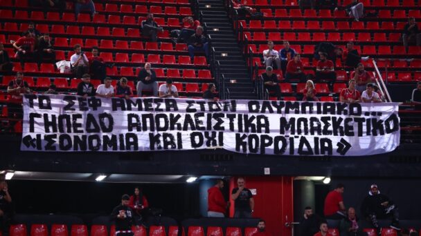 «Το ΣΕΦ άμεσα στον Ολυμπιακό… Γήπεδο αποκλειστικά μπασκετικό. Ισονομία και όχι κοροϊδία» ανέφερε το πανό των «ερυθρολεύκων».