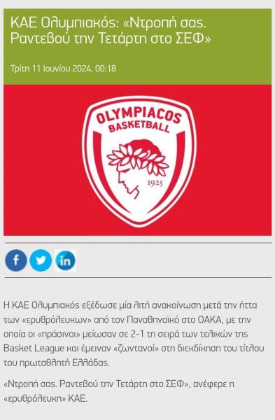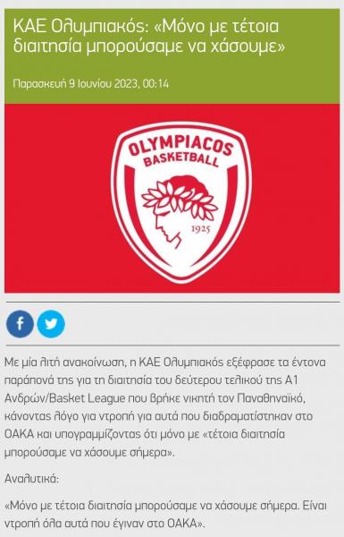 Βέβαια, αυτό δεν η είναι πρώτη φορά που γίνεται από την πλευρά της ερυθρόλευκης ΚΑΕ. Στα περσινούς τελικούς της Basket League, στις 9 Ιουνίου 2023 ο Ολυμπιακός ηττήθηκε με σκορ 67-65 και η σειρά έγινε 1-1.Ο Ολυμπιακός τότε εξέδωσε ανακοίνωση ακριβώς με τον ίδιο τρόπο που το έκανε και φέτος.