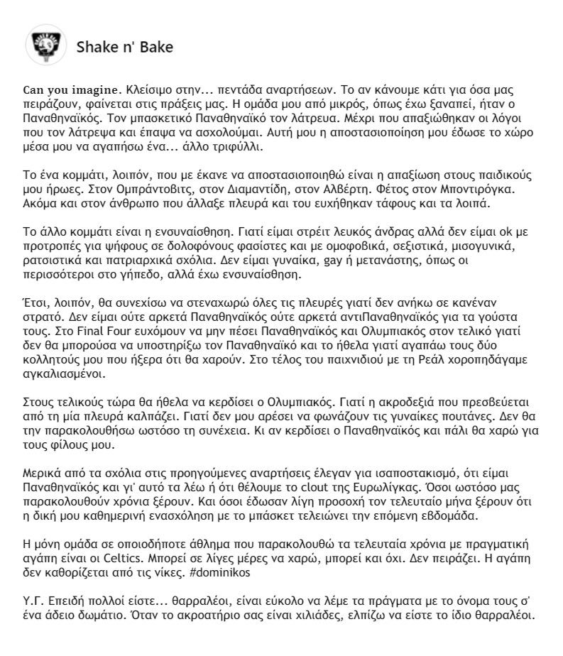 Διαβάστε το εμετικό κείμενο που έγραψε ο Δομήνικος του Shake n’ Bake:
