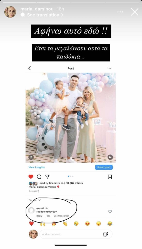 Η σύζυγος του Σλούκα, Μαρία Δαρσινού, δέχθηκε ένα ακόμη αισχρό σχόλιο από χρήστη του Instagram, που έγραψε «Να σου πεθάνουν» αναφερόμενος στα παιδιά τους. Το περιστατικό αυτό ξεπερνά κάθε όριο και έχει προκαλέσει αγανάκτηση τόσο στην αθλητική κοινότητα όσο και στους φιλάθλους.