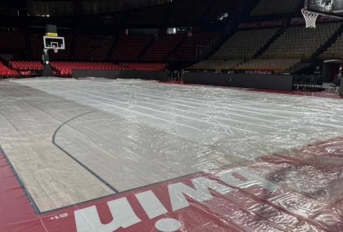 Απρόοπτο στο ΣΕΦ μετά το Ολυμπιακός – Πανιώνιος, καθώς το παρκέ καλύφθηκε με μουσαμάδες για να προστατευτεί από τη βροχή που έσταζε από την οροφή.